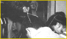 As the ceremony resumes, the shaman places multi-colored string, four to eight feet long, between the patient and the statue. This rainbow bridge forms a magical connection between the possessed and the putla.