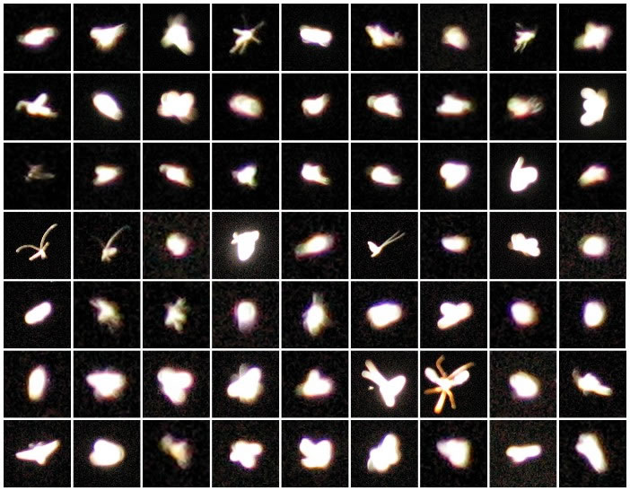 While the luminescence of the dust particles may vary, generally they always appear as fuzzy circles.